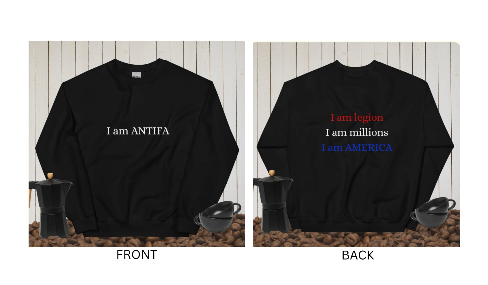 Make a statement that can’t be ignored with this unapologetic design. The front declares “I am ANTIFA”—a stand against fascism and a reminder that opposing hate is not a crime, it’s a responsibility. On the back, the words “I am legion, I am millions, I am America” echo the collective strength of those who believe in justice, equality, and unity. This shirt isn’t just apparel—it’s a declaration of solidarity and defiance. Crafted from soft, breathable fabric, it’s made for those who stand their ground and speak truth to power.